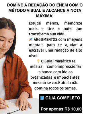 Você não precisa dominar técnicas mirabolantes de argumentação. No Guia Imagético, você vai aprender a pensar com clareza e estratégia, usando imagens mentais como gatilhos para memorizar e aplicar argumentos prontos, todos conectados às áreas do conhecimento mais cobradas no ENEM.